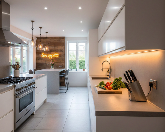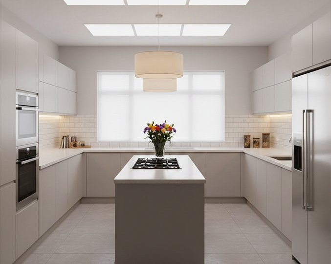 La sicurezza tecnica e la corretta distribuzione della luce nei tre livelli funzionali della cucina.