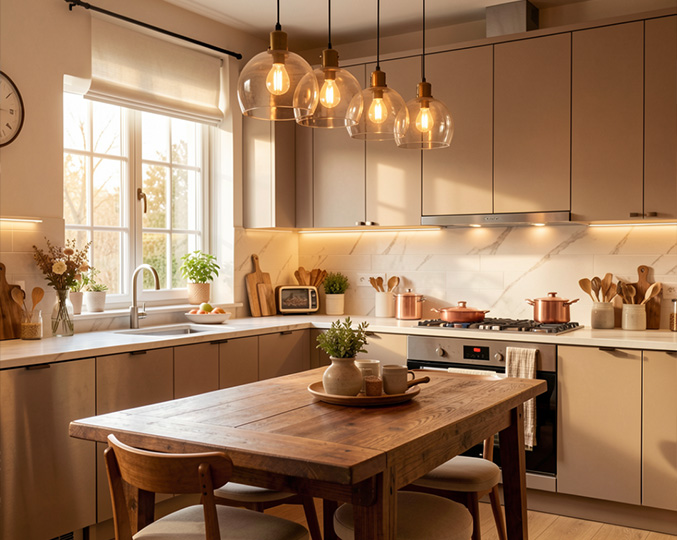 LED strip, lampade a sospensione sopra l'isola, illuminazione interna alle vetrine. Valorizza l'estetica e crea un'atmosfera accogliente.